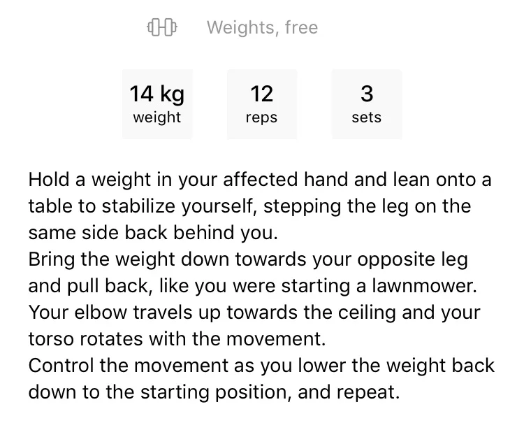 Row - 12 reps each arm. I drastically reduced the weights after surgery and am building back up.