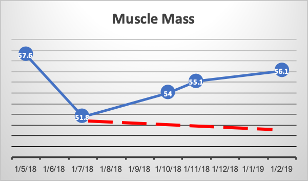 The data tells the story. This is my data in terms of lean muscle mass. The blue line shows the lean muscle mass and the red line shows projected lean muscle mass if I had not worked out (drawn my me).